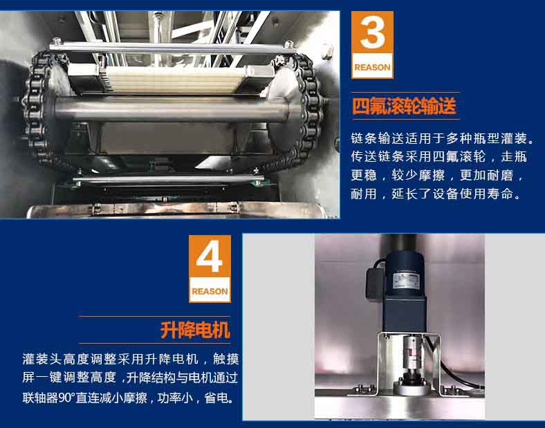 2、链条输送适用于多种瓶型灌装。传送链条采用四氟滚轮,走瓶更稳,较少摩擦,更加耐磨,耐用,延长了设备使用寿命。增加卡瓶口装置:方便瓶口小的容器灌装,灌装头和瓶口的定位更准确;采用O型挡板,屏蔽涨紧轮的弊端(采用鱼眼调节链轮的松紧度),输送采用四氟滚轮式,容器输送更平稳,可正反转输送;