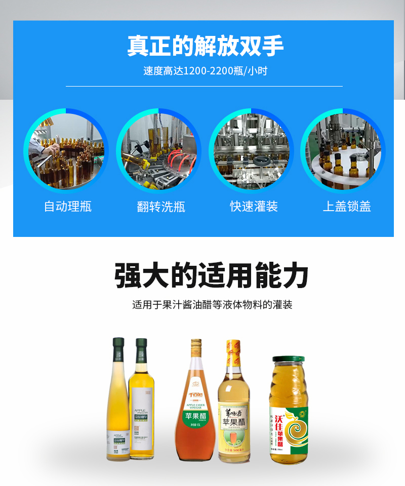 该系列果醋灌装机采用伺服柱塞式计量灌装原理,多项专利认证,适用于各种规格(0.1-1升可兼顾到2升灌装)的液体灌装。