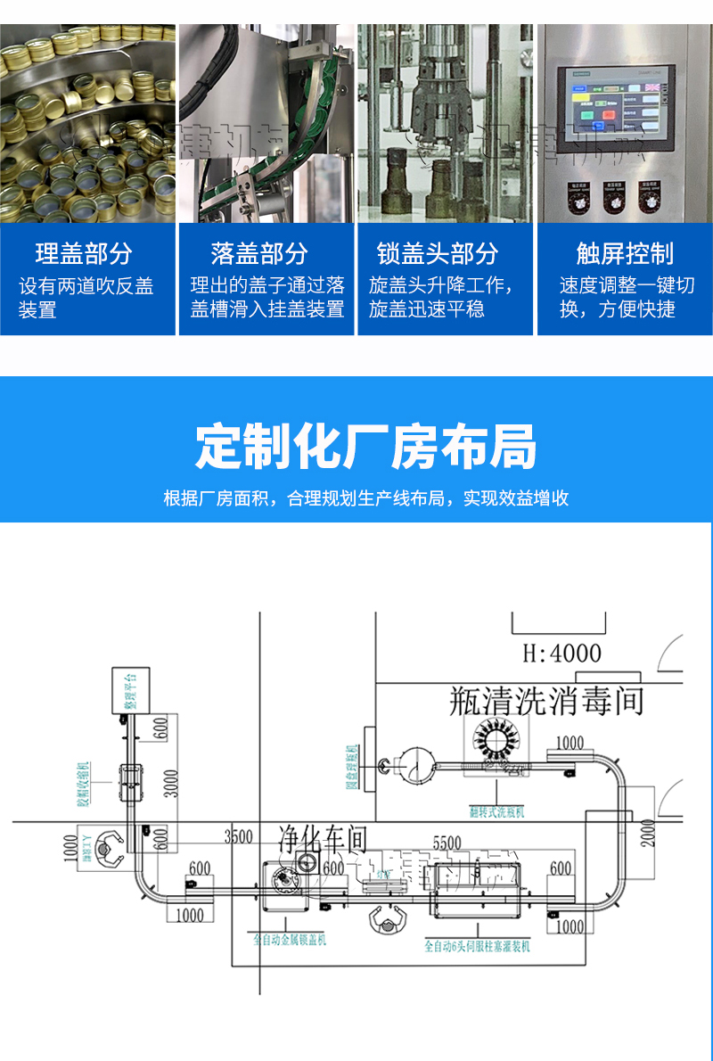 本设备适用于医药、农药、食品、化妆品、化工等行业,主要针对各种玻璃瓶口的金属防盗盖、铝封盖的封口、压螺纹等。该设备可单机使用,也可以与灌装机等设备组成生产流水线自动作业;