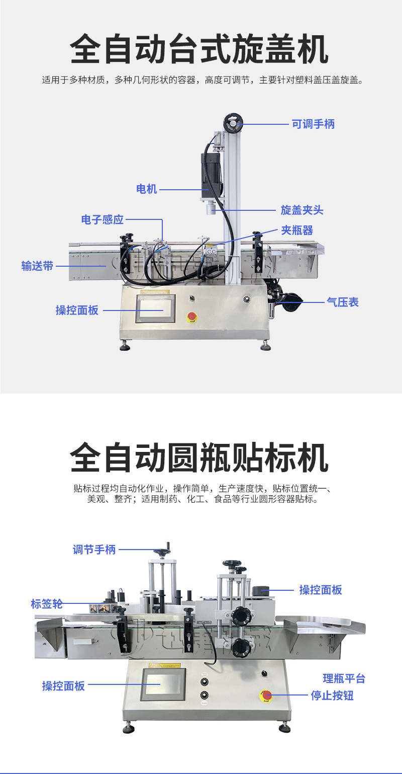 产品说明:桌面型膏液灌装生产线根据灌装范围选择型号,灌装部分为双头下潜式灌装机,适用于不同物料不同瓶子的灌装,配备自动压盖机和圆瓶贴标机,可实现不同盖子的旋盖贴标工作。