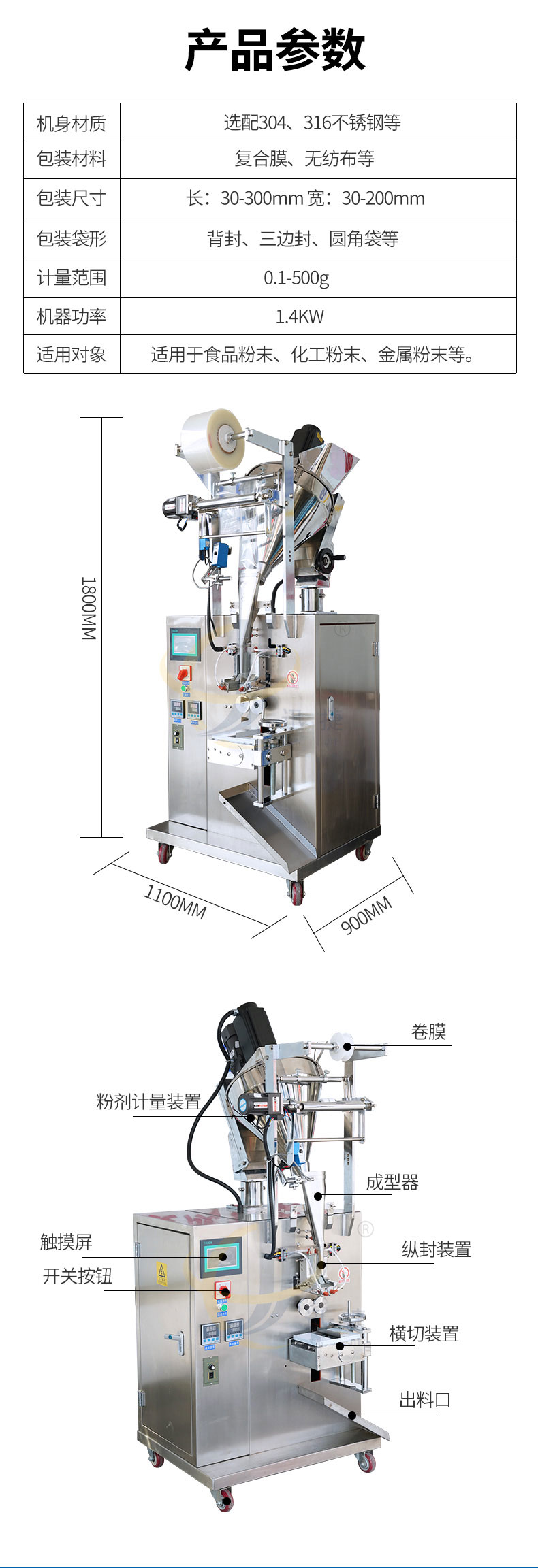 适用于食品行业、日用品行业、生活用品行业。餐饮用品等行业产品包装如三七超细粉、奶粉、豆粉、中药粉、调料粉、鸡精、盐、砂糖、等产品。