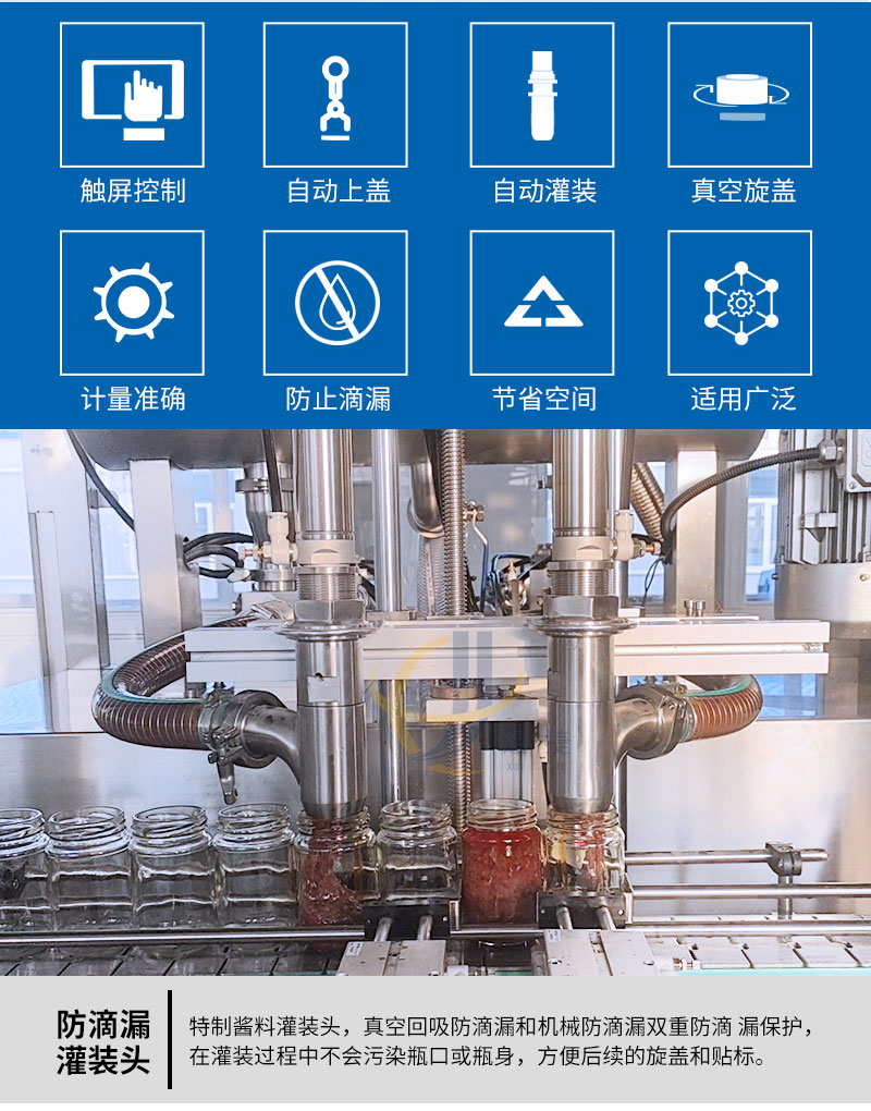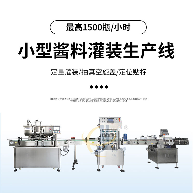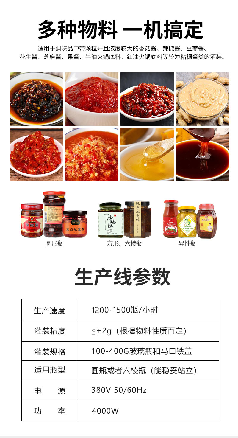 小型酱料灌装生产线适用于调味品中带颗粒并且浓度较大的香菇酱、辣椒酱、豆瓣酱、花生酱、芝麻酱、果酱、牛油火锅底料