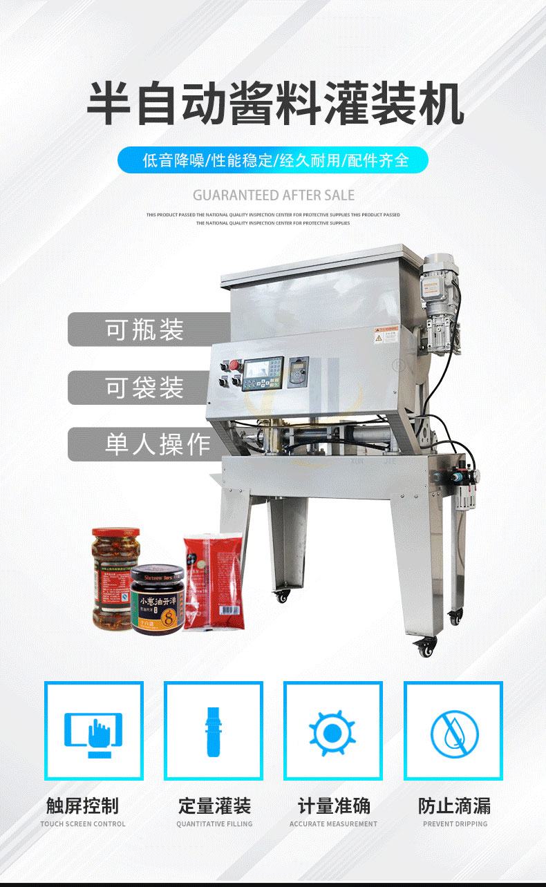 半自动酱料灌装机适用于辣椒酱、豆瓣酱、拌面酱、大块肉酱等物品的定量充填分装,适用于将各类粘稠体及含有各种固体物质