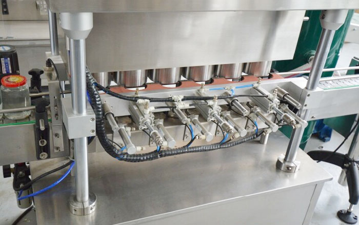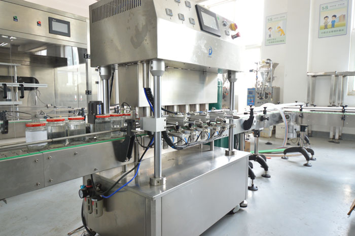 罐头真空封盖机用于调味品酱、水产罐头、水果罐头等采用目前环保的玻璃瓶包装后对瓶内真空度有比较高要求的三旋、四旋盖的玻璃瓶进行封盖,本机配上真空系统后,能先对玻璃瓶内进行抽吸真空,然后再进行旋盖封口,以延长瓶内容物的保质期及增强口感,而且不用加热以保持物料色泽不变。实行自动进瓶、自动封盖、自动进行抽真空。