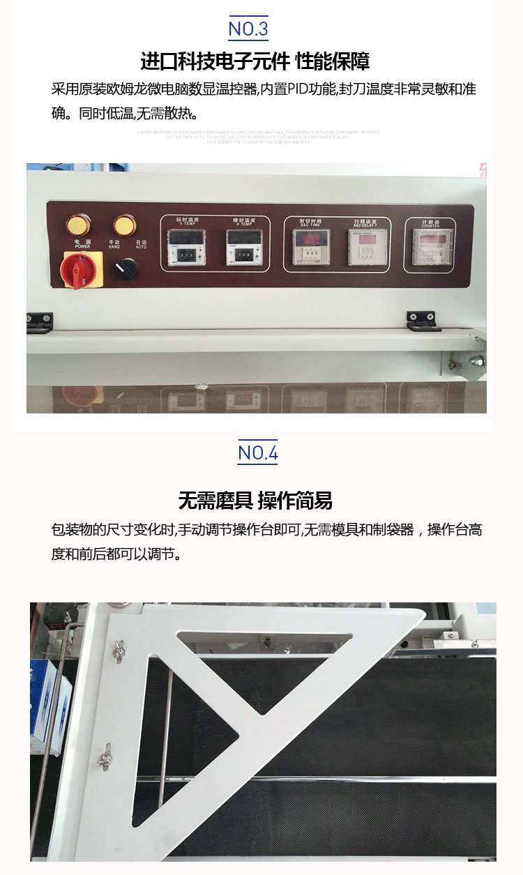 配合L型封切刀使收缩膜包装一次封切成型,镀特氟龙不粘层封口布,封切不黏膜,且封口整齐不开裂,产品经封切后,进入自动塑料膜热收缩包装机完成包装。