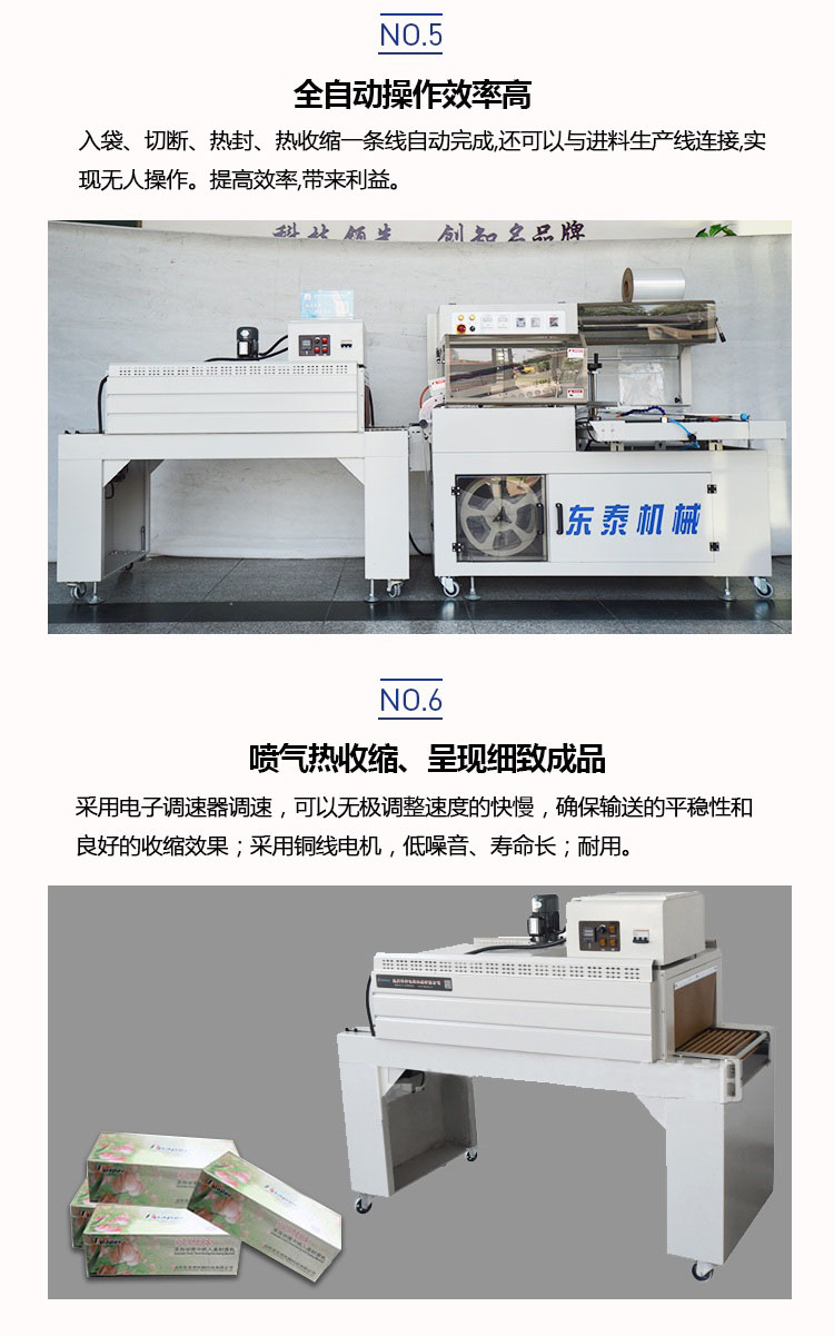 自动塑料膜热收缩包装机结构紧凑占地面积小,非常适合配套自动包装流水线完成产品的自动无人化包装,适合于单个物品包装或有底托物品包装。自动送膜打孔装置和手动调节的导膜系统以及手动调节的进料输送平台,可适于不同宽度和高度的产品,实现一台机器满足各种尺寸的包装物品。