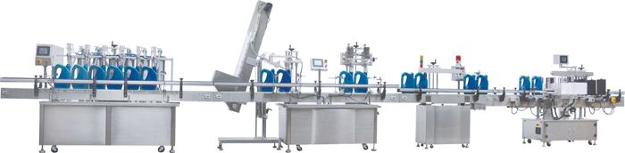 灌装机+提盖理盖机+旋盖机+铝箔封口机+贴标机